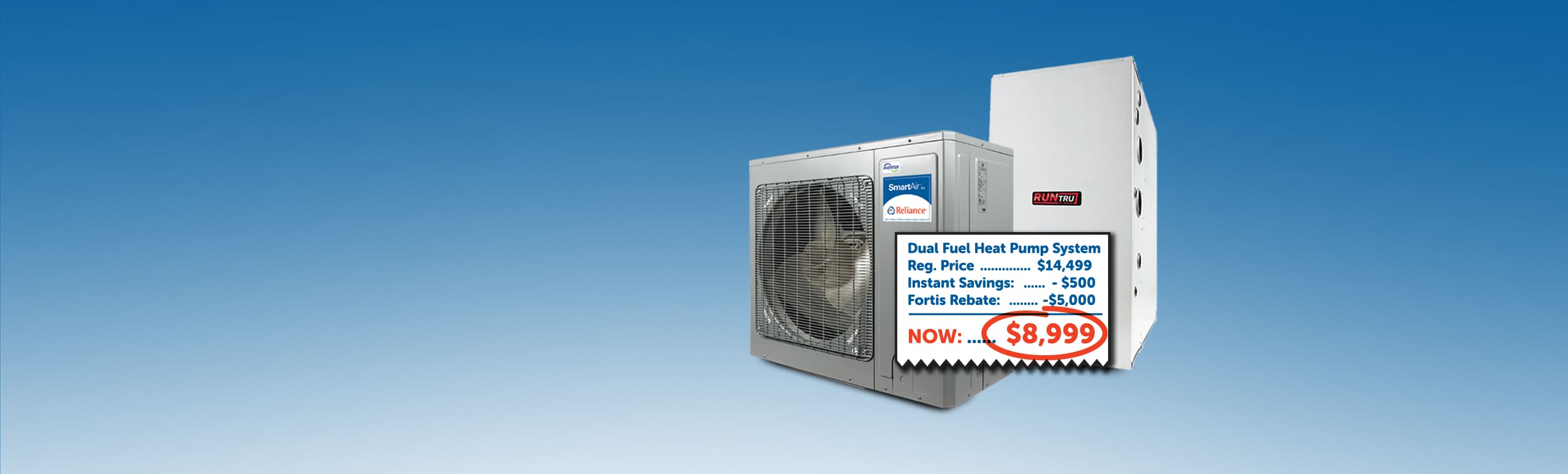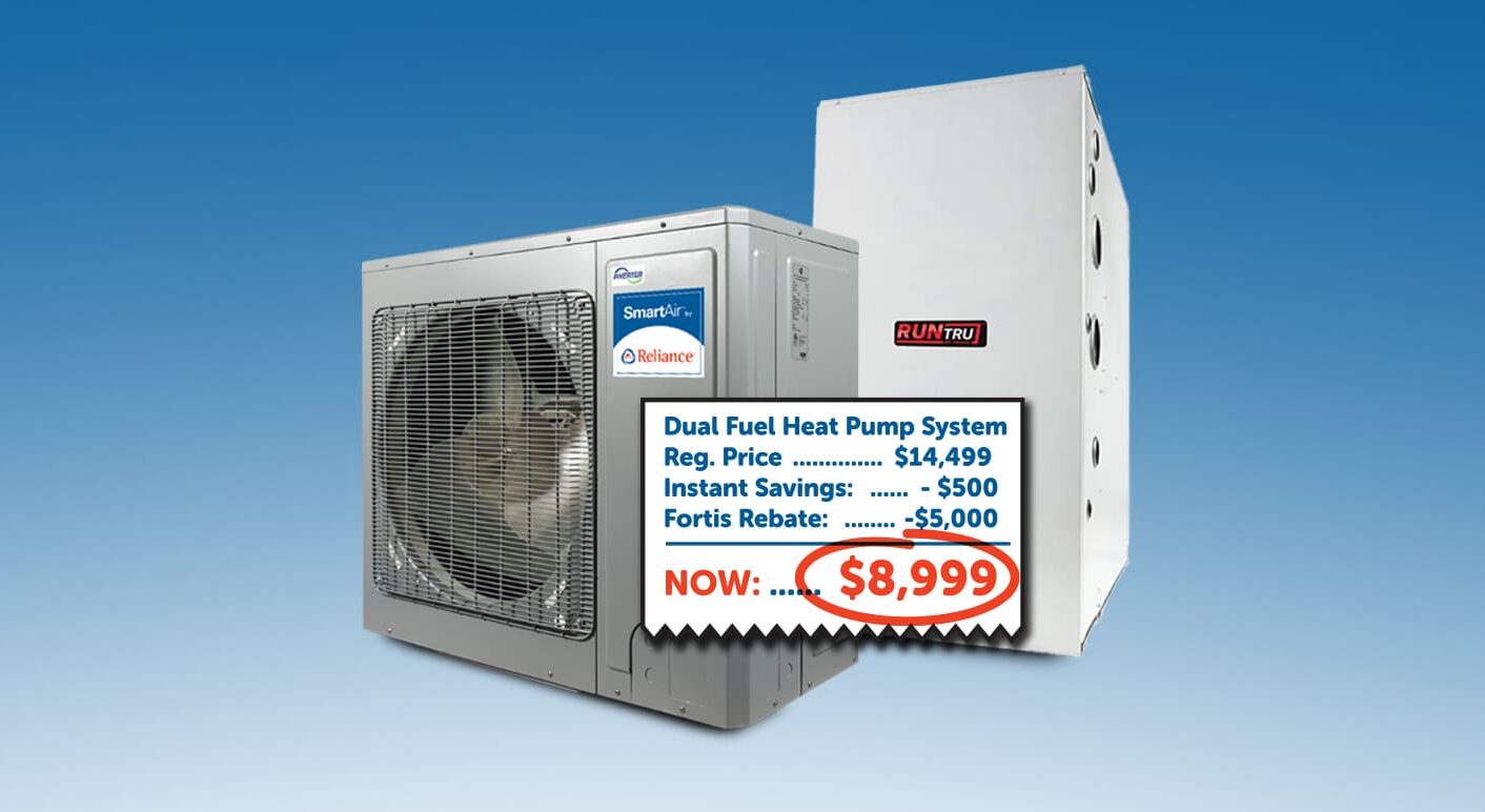 *The offer is only available in British Columbia to residential customers when purchasing a 2 ton or 3 Ton SmartAir 8100 Heat Pump with a 60 or 80K BTU RunTru A952V upflow furnace (up to 96% efficiency). The retail price of the SmartAir 8100 Heat Pump System is $14,499 plus applicable taxes in British Columbia. After applying a $500 discount and the $5,000 FortisBC Dual Fuel rebate, the total cost of the system is $8,999 plus applicable taxes. Downflow furnaces in 60k BTUs are also available for additional charges. Quantities are limited. Customers must purchase the rebate-eligible equipment for its full purchase price from Reliance. Customer must apply and qualify for the FortisBC rebate independent of Reliance. Please refer to the FortisBC website for the full terms, conditions and eligibility requirements of the rebate program. We reserve the right to cancel or change this offer at any time. Contact us for details