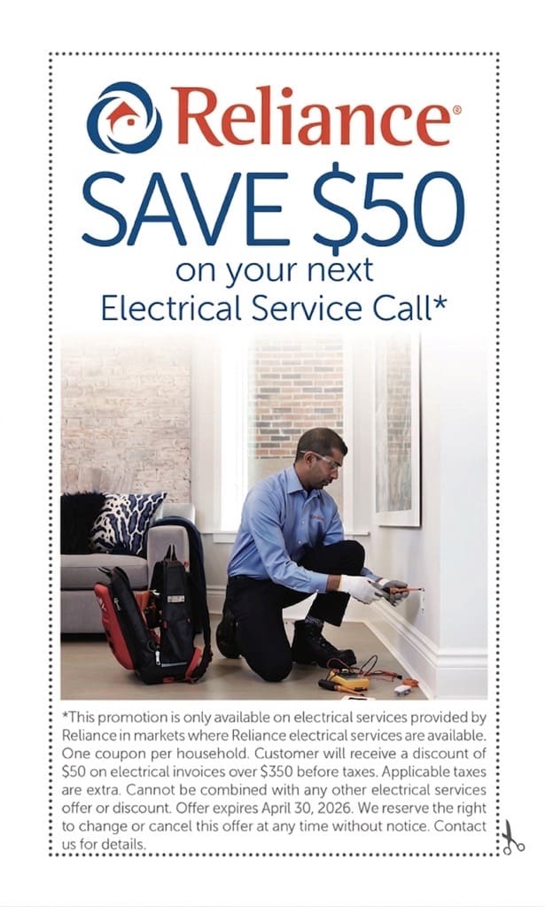 This promotion is only available on electrical services provided by Reliance in markets where Reliance electrical services are available. One coupon per household. Customer will receive a discount of $50 on electrical invoices over $400 before taxes. Applicable taxes are extra. Cannot be combined with any other electrical services offer or discount. Offer expires April 30, 2026. We reserve the right to change or cancel this offer at any time without notice. Contact us for details.